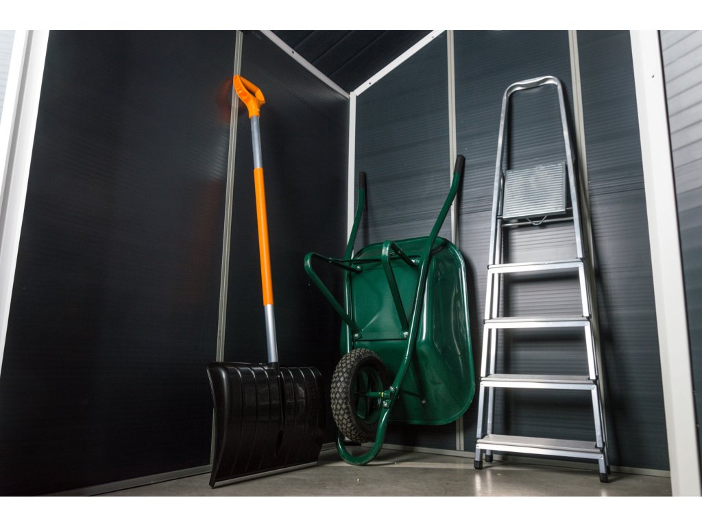 Konštrukcia záhradného domčeka G21 sa skladá z pozinkovaného plechu, plastových stĺpikov s hrúbkou materiálu 1,5 mm a vonkajších panelov s hrúbkou 12 mm. Panely sú vyrobené zo sendvičového tvrdeného plastu. Strecha záhradného domčeka je skonštruovaná tak, aby vydržala zaťaženie až 60 kg/m2. Na prednej strane domčeku sú umiestnené dvojkrídlové dvere so šírkou 151cm a výškou 183 cm, ktoré zaisťujú jednoduchý prístup.