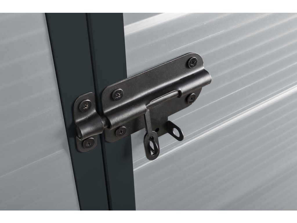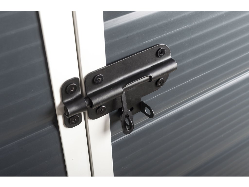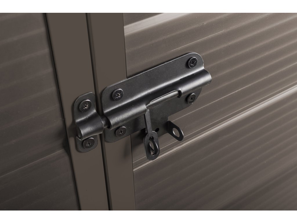 Nad dvojkrídlovými dverami je umiestnená ventilačná mriežka, ktorá zabezpečuje dostatočné odvetrávanie a cirkuláciu vzduchu vo vnútri domčeka. Preto sa nemusíte báť plesní alebo zrážaní vody na stenách v prípade náhlych zmien teploty.