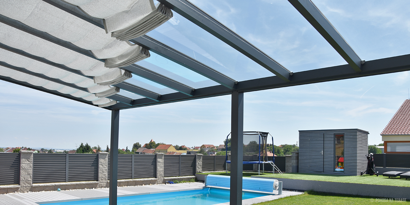 Hliníková pergola so strechou z POSUVNÝMI SKLAMI