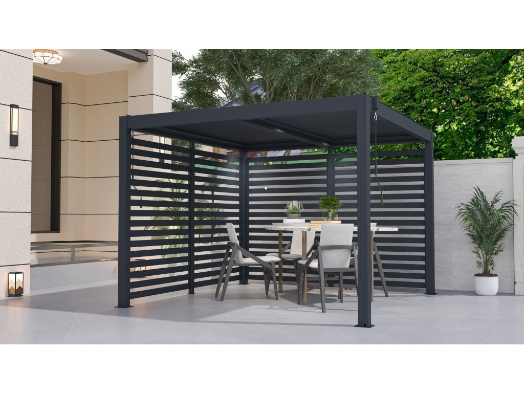 Stena je pevná, bez možnosti naklápania lamiel – má tak väčšiu stabilitu a dodáva účinnú ochranu po celý rok. Elegantný dizajn v antracitovom prevedení skvele doplní pergolu a prispôsobí sa rôznym štýlom vonkajších priestorov. Inštalácia je jednoduchá a prispôsobená presne na rozmer pergoly Austin.