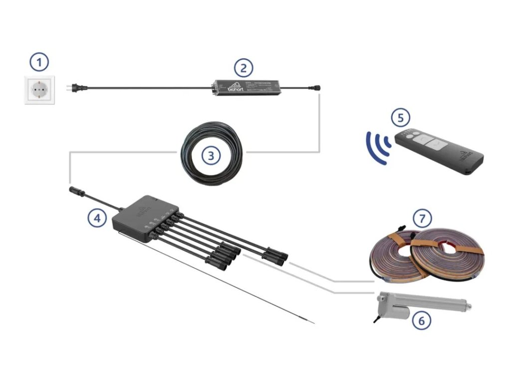 Vďaka riadiacej jednotke, diaľkovému ovládaniu, napájaciemu zdroju (max. 320W) a predlžovaciemu káblu špeciálne vyvinutému pre Biohort je možné elektromotor a/alebo stmievateľné LED osvetlenie kedykoľvek jednoducho dodatočne namontovať.