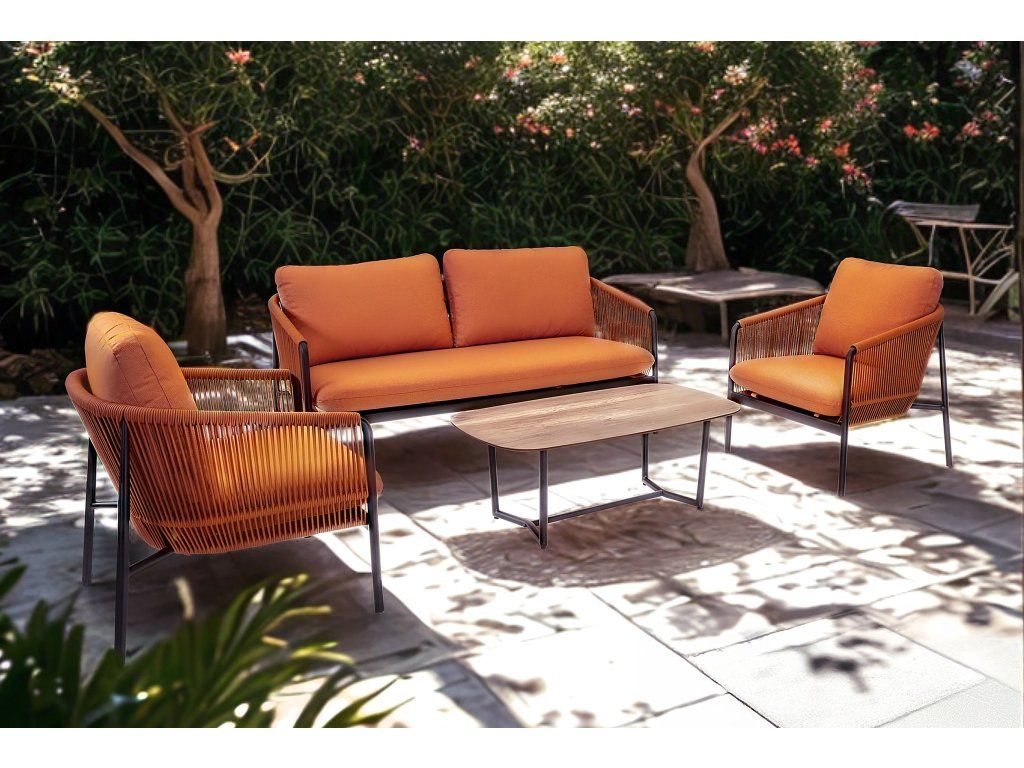 Vankúše s hustotou 277gr/m² poskytujú maximálny komfort a sú odolné voči poveternostným vplyvom. Oranžovo terakotový lanový výplet s priemerom 5 mm dodáva súprave štýlový a elegantný vzhľad, ktorý sa hodí do každého exteriéru.