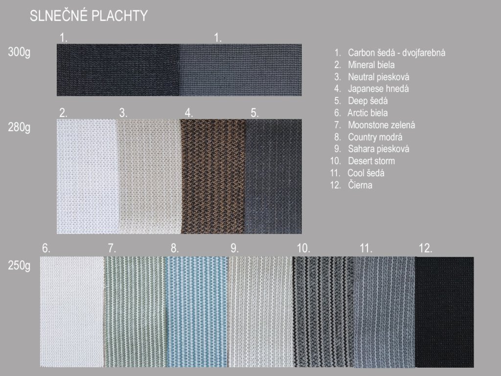 Slnečná plachta je vyrobená z veľmi odolného tkaného polyetylénu HDPE (High-Density PolyEthylen), z ktorého sa vyrábajú aj vodovodné plastové trubky. Poskytuje až 95% ochranu pred UV žiarením. Látka je hrubo tkaná (vrecovina), stálofarebná, mierne dierkovaná a prepúšťa vodu. Slúži ako ochrana proti slnku na vytvorenie tieňa, nie proti dažďu!