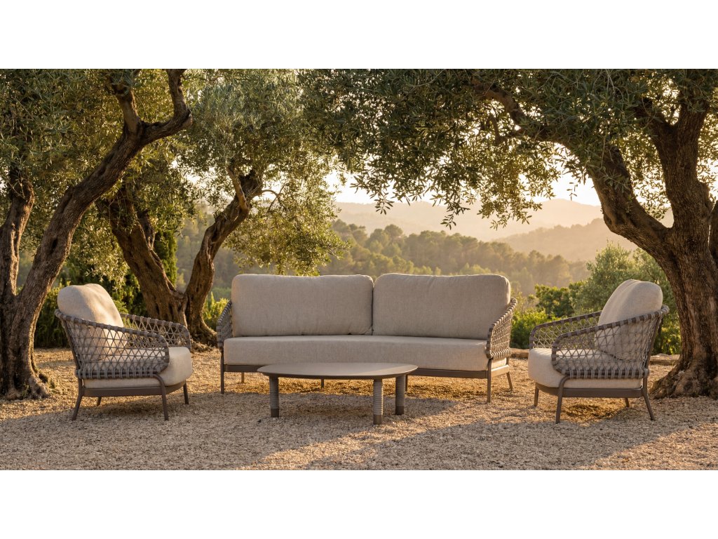 Juno sedacia súprava kombinuje rafinovaný kovový rám s ručne tkaným lanom, čím vytvára otvorený a vzdušný vzhľad. Je ideálna pre tých, ktorí hľadajú štýlový a funkčný nábytok do záhrady.