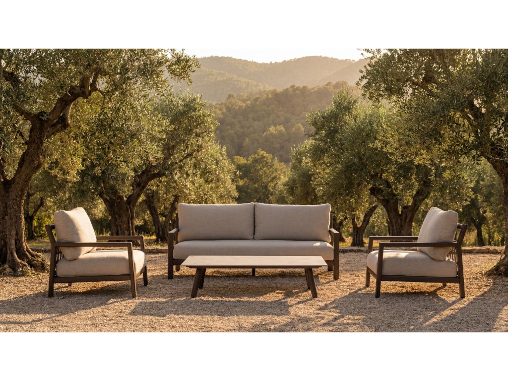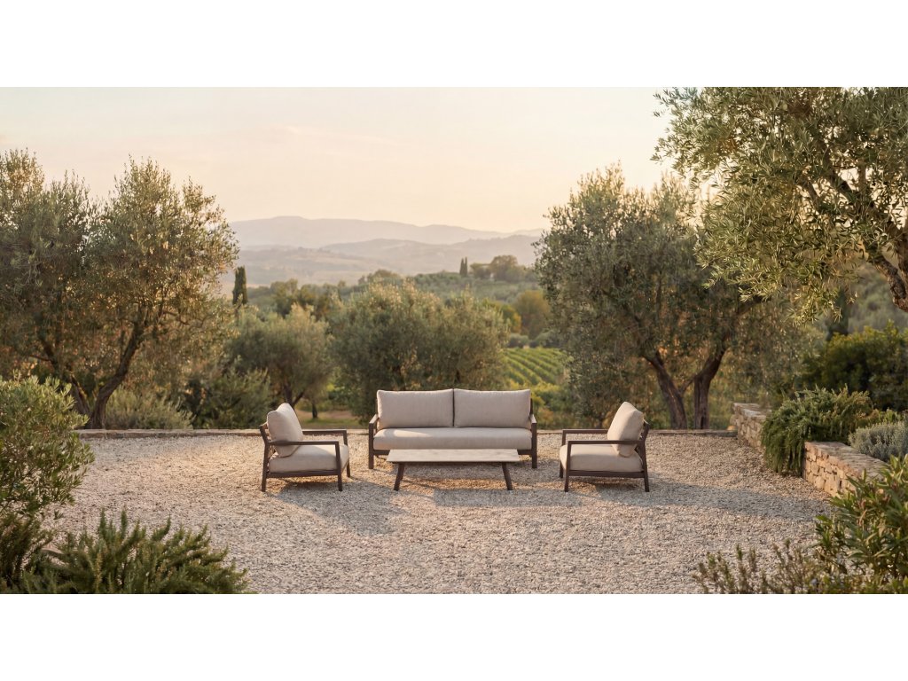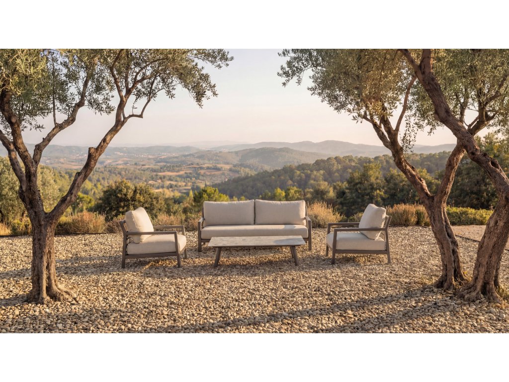 Sedacia súprava Oasis ponúka pokoj a eleganciu vďaka hliníkovému rámu v teplom odtieni. Jej jemné línie a veľkoryso dimenzované vankúše čalúnené látkou Olefin zaručujú pohodlie.
