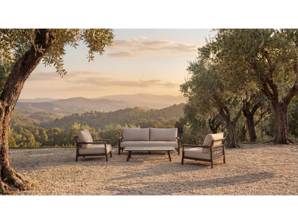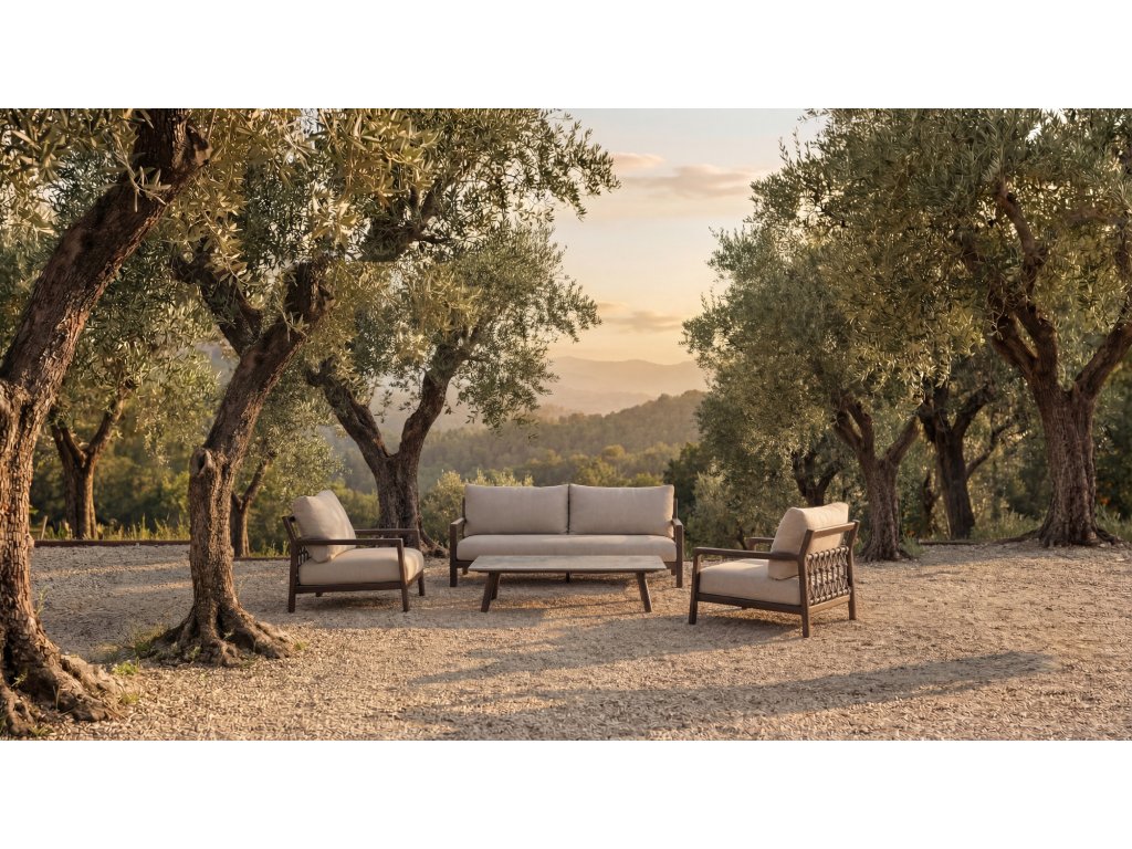 Moderný a nadčasový dizajn umožňuje, aby sa súprava Oasis bez námahy začlenila do minimalistických aj sviežich zelených záhrad. Je ideálna pre tých, ktorí hľadajú štýlové a funkčné riešenie pre vonkajšie posedenie.
