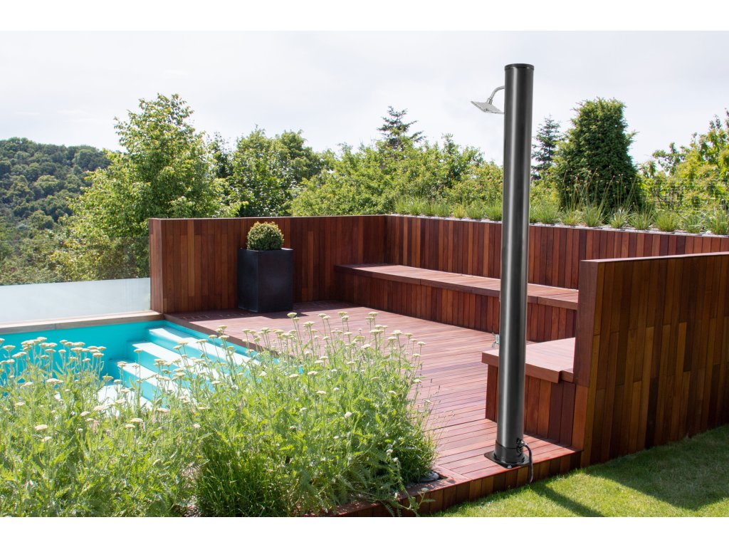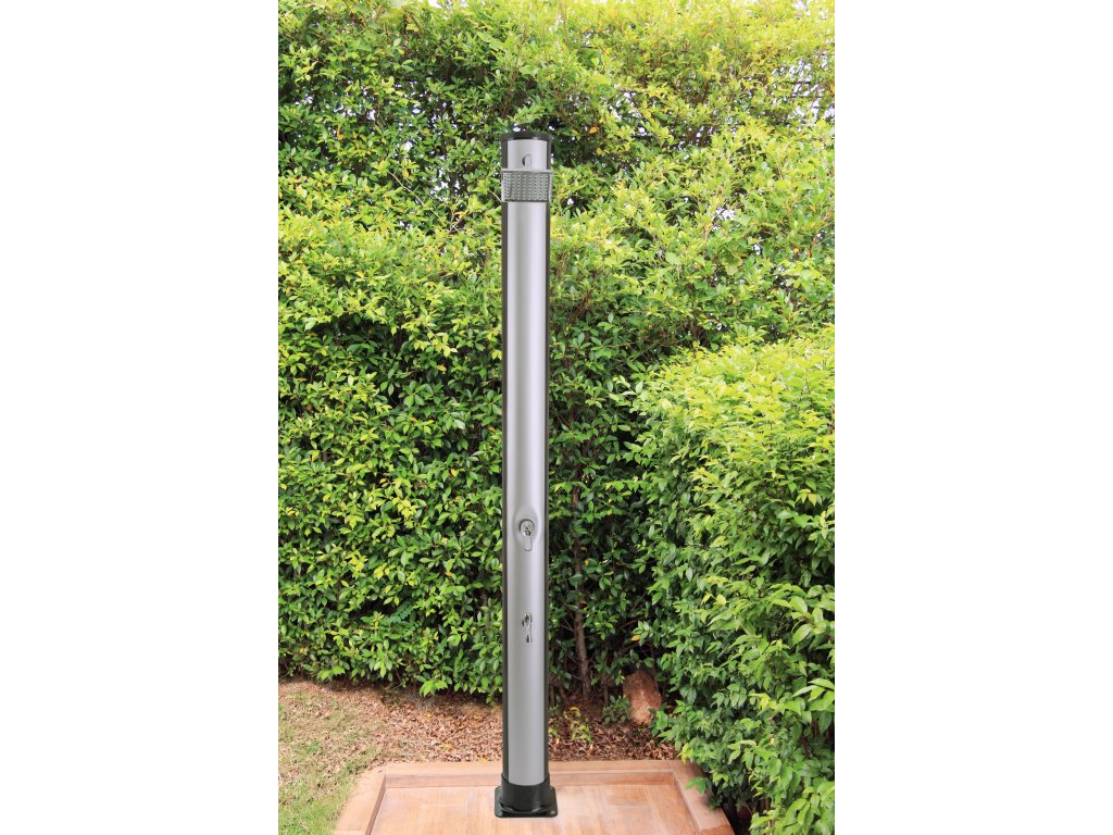 Telo sprchy v elegantnej čierno-striebornej farbe slúži zároveň ako solárny kolektor - absorbuje slnečné lúče a ohrieva vodu bez potreby elektriny či plynu. Keď si doprajete sprchu pred plávaním, ochránite vodu v bazéne pred zbytočným znečistením. Tým si výrazne uľahčíte jeho údržbu.