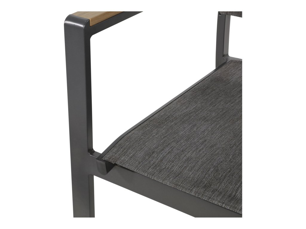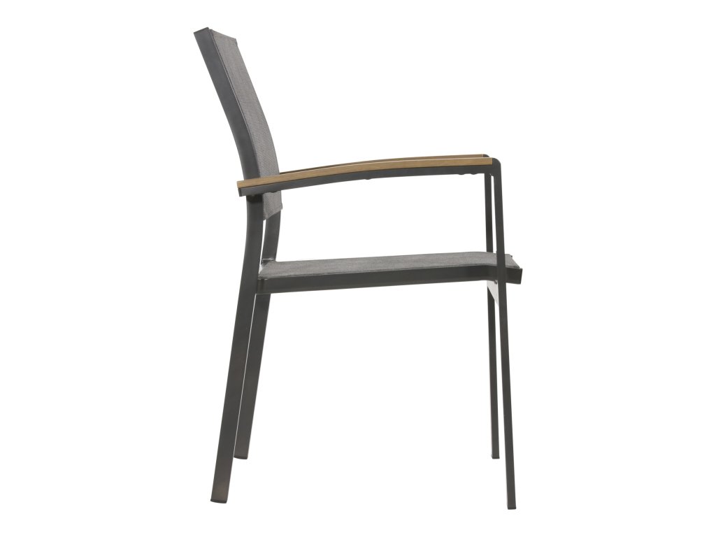 Hliníkový rám stoličky je v elegantnej antracitovej farbe. Opierky rúk sú z polywoodu - materiál imitujúci drevo, založený na kompozitoch z dreva a polyméru. Látka textilen 490 gr/m².
