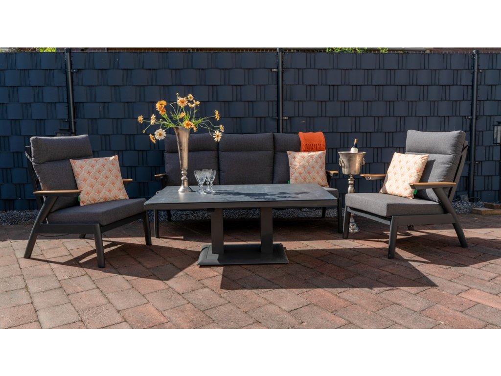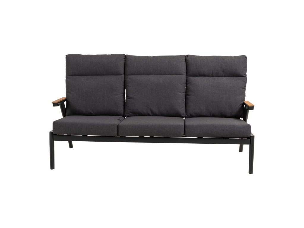 Hliníkový rám sedacej súpravy je v elegantnej antracitovej farbe. Podsedáky a vankúše sú z 220 gr/m² Olefinu v elegantnej šedej. Dekoratívna ozdoba opierok rúk vo vzhľade teak.