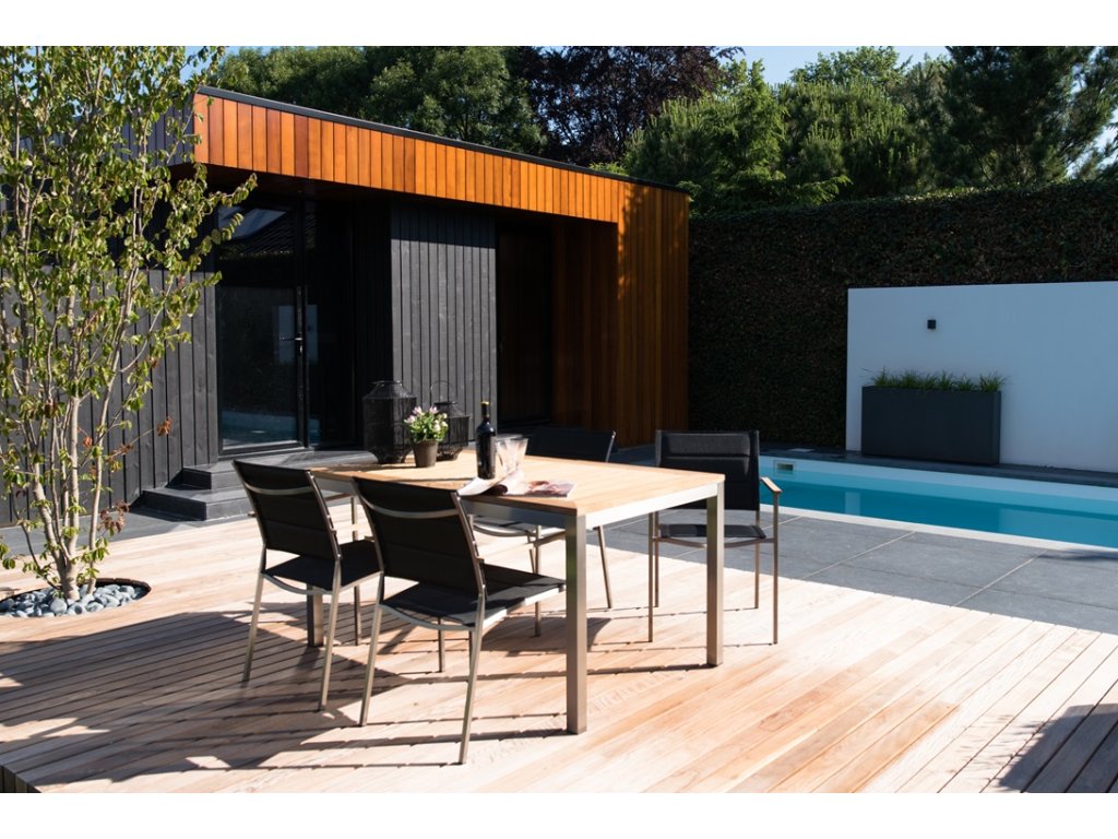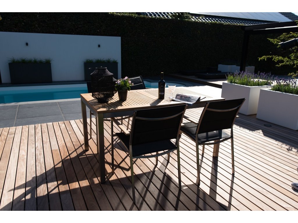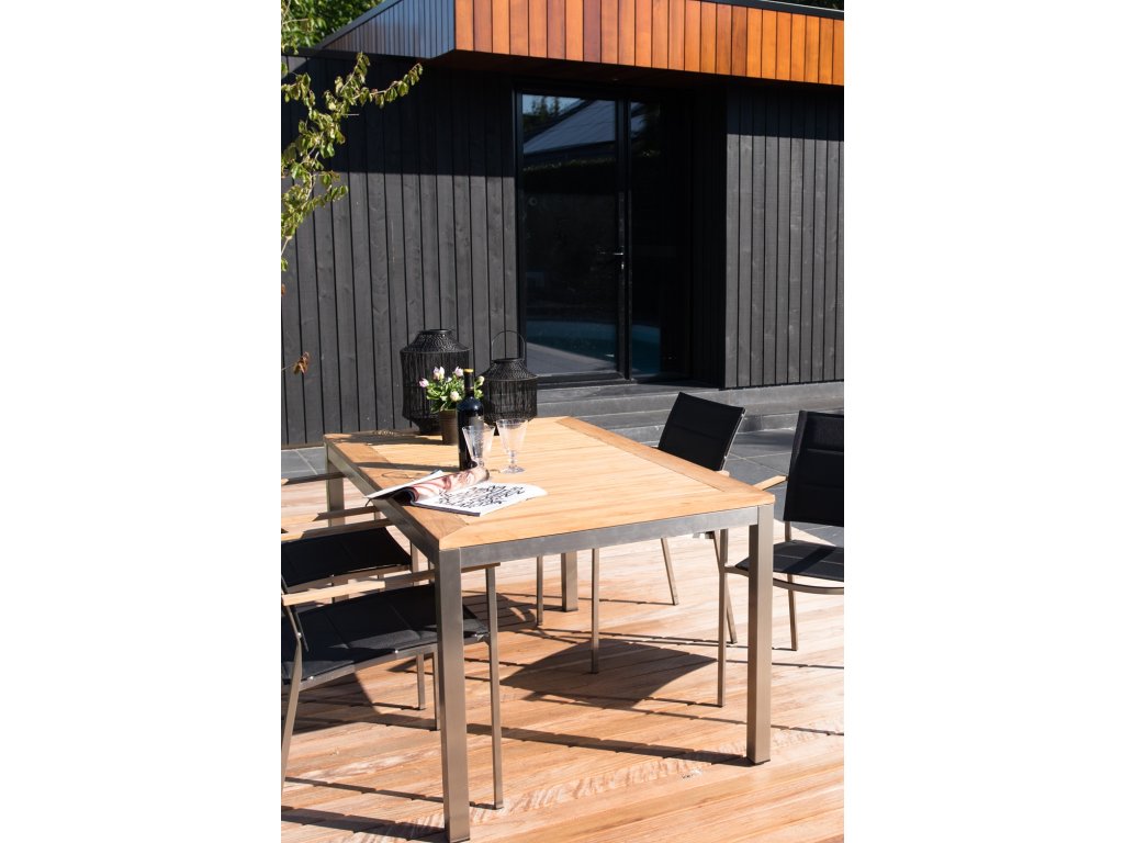 Jedálenský stôl Condor má elegantný a robustný vzhľad. Moderný dizajn zvýrazňuje matný čierny hliníkový rám a teaková prírodná doska.