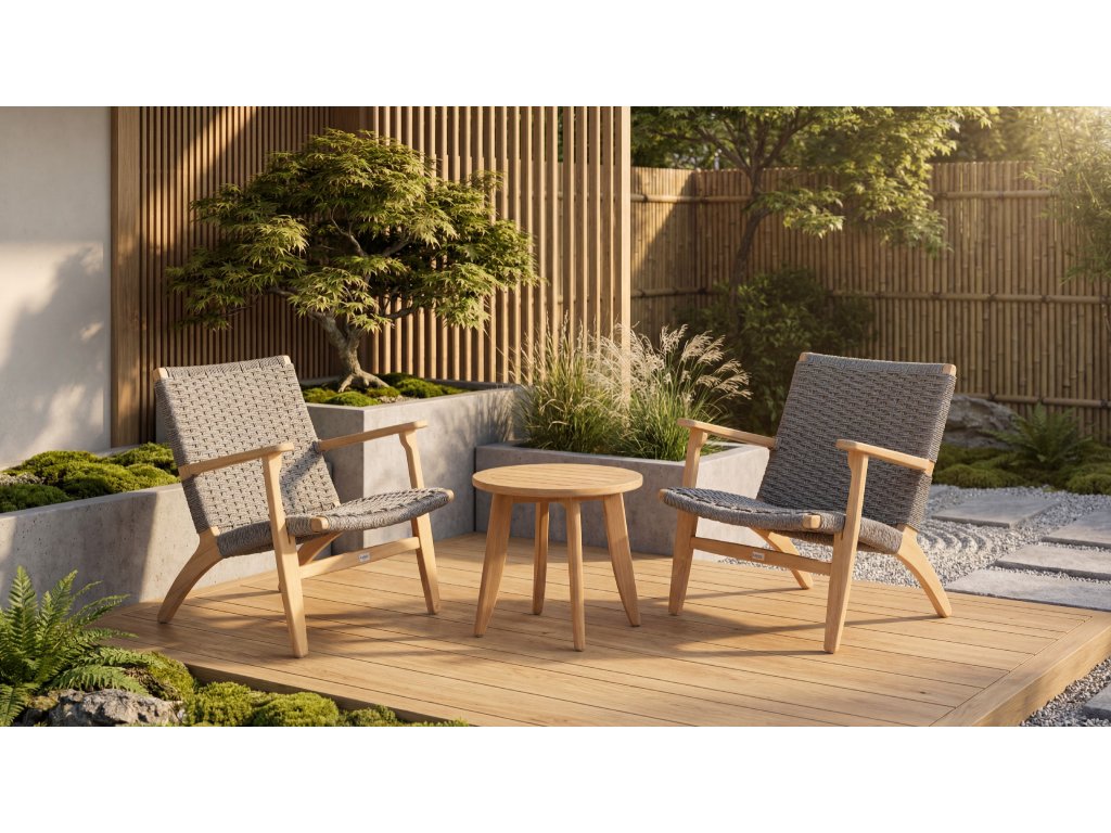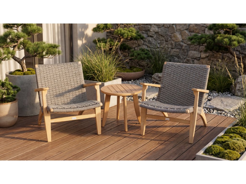 Súprava obsahuje dve pohodlné kreslá a štýlový teakov stolík. Tento dizajn kombinuje funkčnosť s eleganciou, čím zvyšuje estetiku vášho exteriéru.