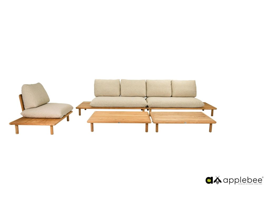 V jednoduchosti je krása. Svoje veci si jednoducho uložíte na integrované stolíky. Rozmery modulov sú veľkorysé, aby ste si vytvorili naozaj pohodlie. Dizajn vankúšov a vankúšových popruhov podčiarkuje uvoľnenú atmosféru, ktorou tento set dýcha. Pekným detailom je uzlík, ktorý je umiestnený cez teakový rám, aby držal chrbtový vankúš. Každý sedací prvok - okrem rohového - má integrovaný stolík. Okrem toho je tu konferenčný stolík, ktorý rovnako ako ostatné ponúka dostatočný priestor.