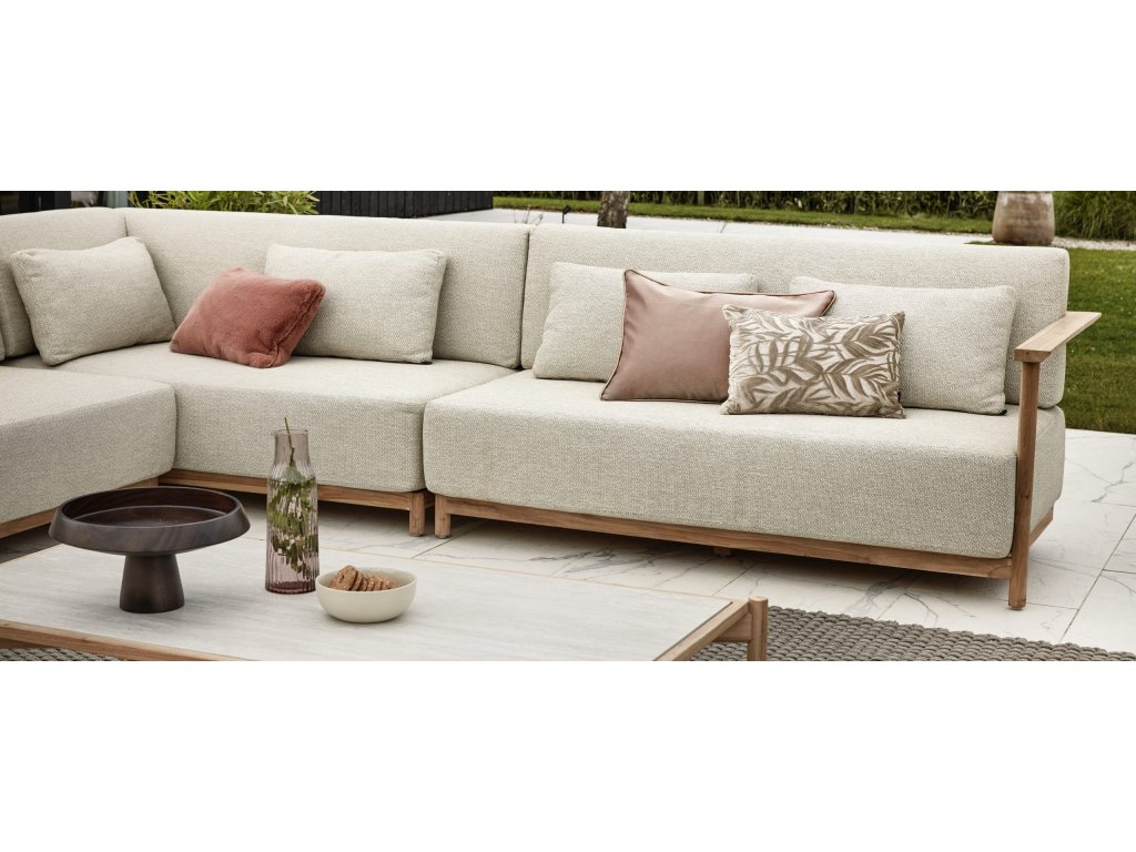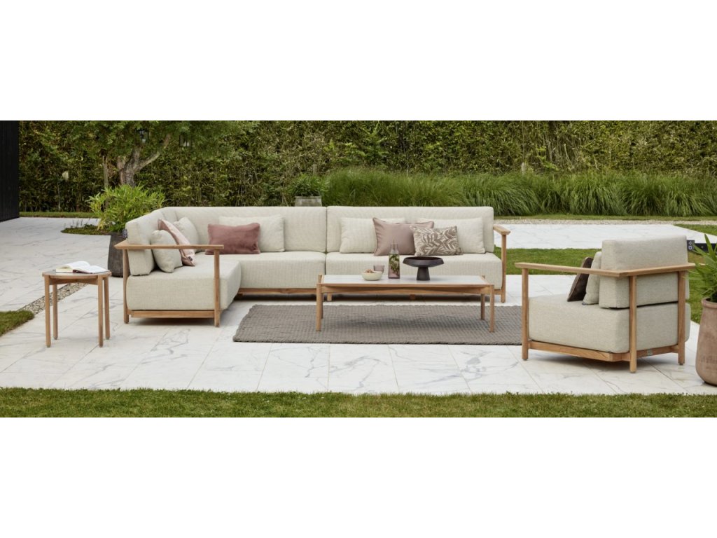 K dispozícii sú dva rôzne zodpovedajúce stolíky, obdĺžnikový konferenčný stolík a okrúhly príručný stolík. Obe majú rovnako krásny teakový rám a keramickú stolovú dosku s motívom travertínu krémovej farby. To dokonale ladí so zvyškom farebnej palety. Urobte si jednu dlhú pohovku s dvoma pohovkami alebo vytvorte priestranné rohové usporiadanie s 3 alebo dokonca 4 pohovkami. Chcete pridať samostatné kreslo?
