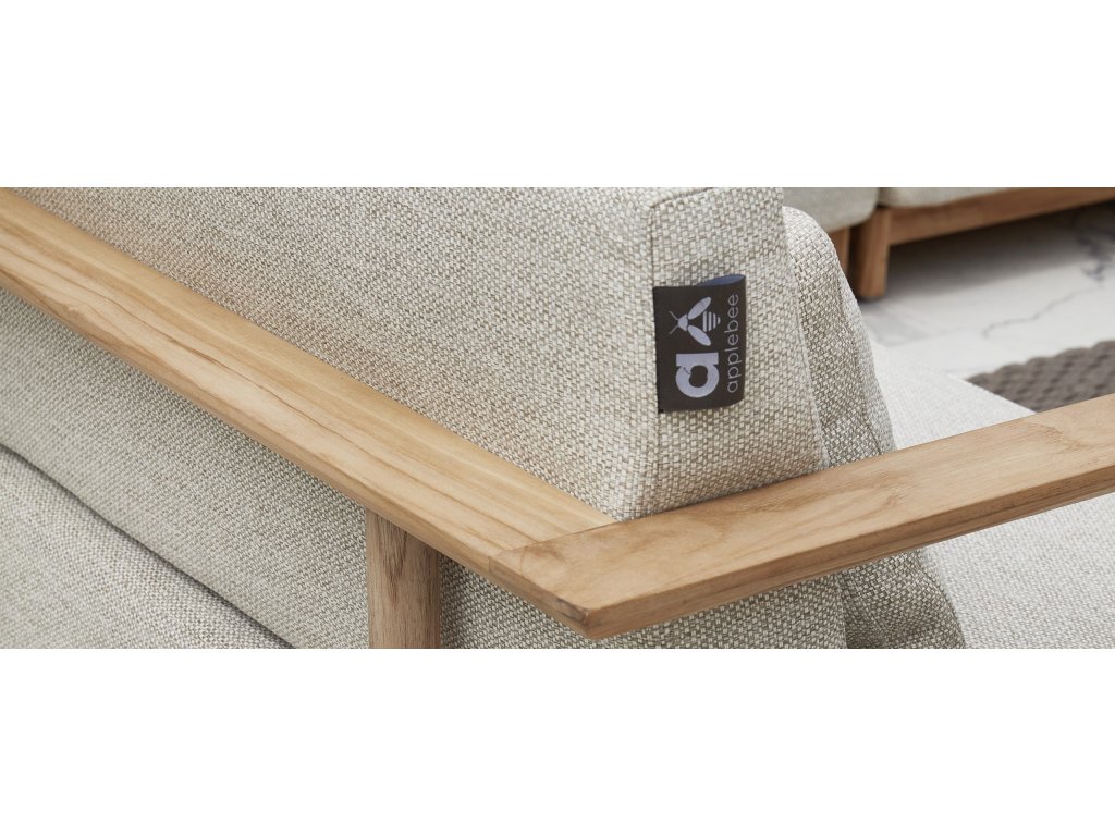 Aké luxusné chcete mať vankúše vašej sedacej súpravy? The St. Lucia Teak Lounge má podsedáky s hrúbkou minimálne 25 cm, samozrejme v kvalite Apple Bee ‘Bee Wett’. Aj keď by ste to možno nečakali, tieto vankúše tiež schnú podstatne rýchlejšie ako vankúše so štandardnou penou. Vďaka enormne hrubým vankúšom nadobudne Svätá Lucia okamžite veľmi luxusný vzhľad, no zostáva moderná vďaka svojmu uhladenému tvaru a pevnosti. Čiastočne je to samozrejme zásluhou rámu z kvalitného teaku SVLK v prírodnej farbe. Okrúhle nohy prechádzajú do vkusne tvarovaného operadla, ktoré siaha od ruky cez chrbát, čo vás akoby objímalo. Svätá Lucia je robustná a rafinovaná vo všetkých správnych proporciách!