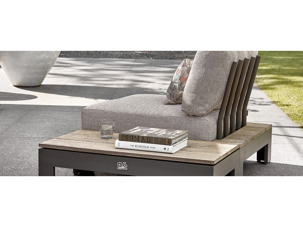 Hliníkový rám s farbou taupe a vrchná doska z teaku dodávajú kávovému stolíku Sticks and More jedinečný charakter, ktorý hľadáte vo svojej záhrade.