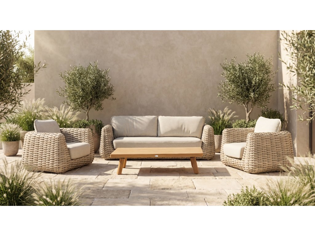 Wakkanda má jemný, príjemný a prirodzený vzhľad. Zaoblená tkaná štruktúra dodáva súprave organický, sochársky charakter, zatiaľ čo svetlé tóny vytvárajú pokojnú a rafinovanú atmosféru. Veľkoryso polstrované vankúše, čalúnené olefínovou látkou, zvyšujú pohodlie a vizuálnu mäkkosť, výsledkom čoho je uvoľnený a vyvážený vzhľad, ktorý pôsobí v každej záhrade elegantne a bez námahy.