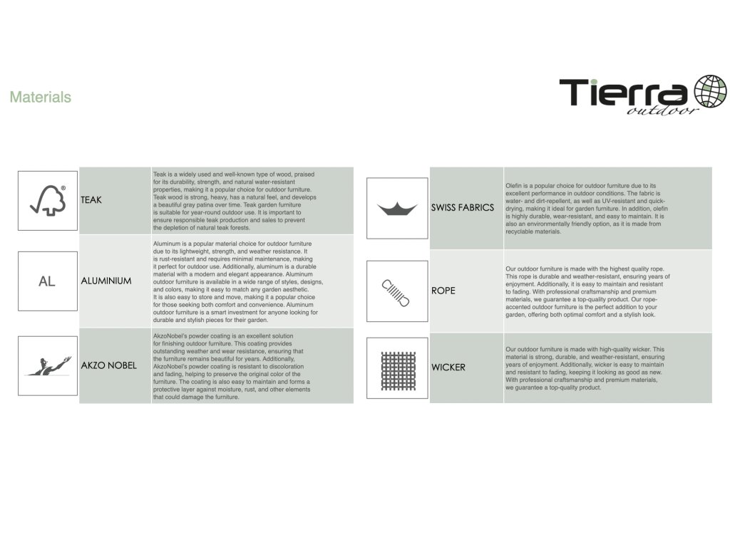 Vybraté sú tie najkvalitnejšie materiály od známych značiek, ako sú Alcoa a Akzo Nobel. Okrem toho Tierra Outdoor používa hrubšie hliníkové spoje a viacero vrstiev práškového lakovania, aby produkty pozdvihla na vyššiu úroveň. To odráža našu dôveru vo vynikajúcu kvalitu týchto materiálov a naše odhodlanie k dlhej životnosti týchto produktov.