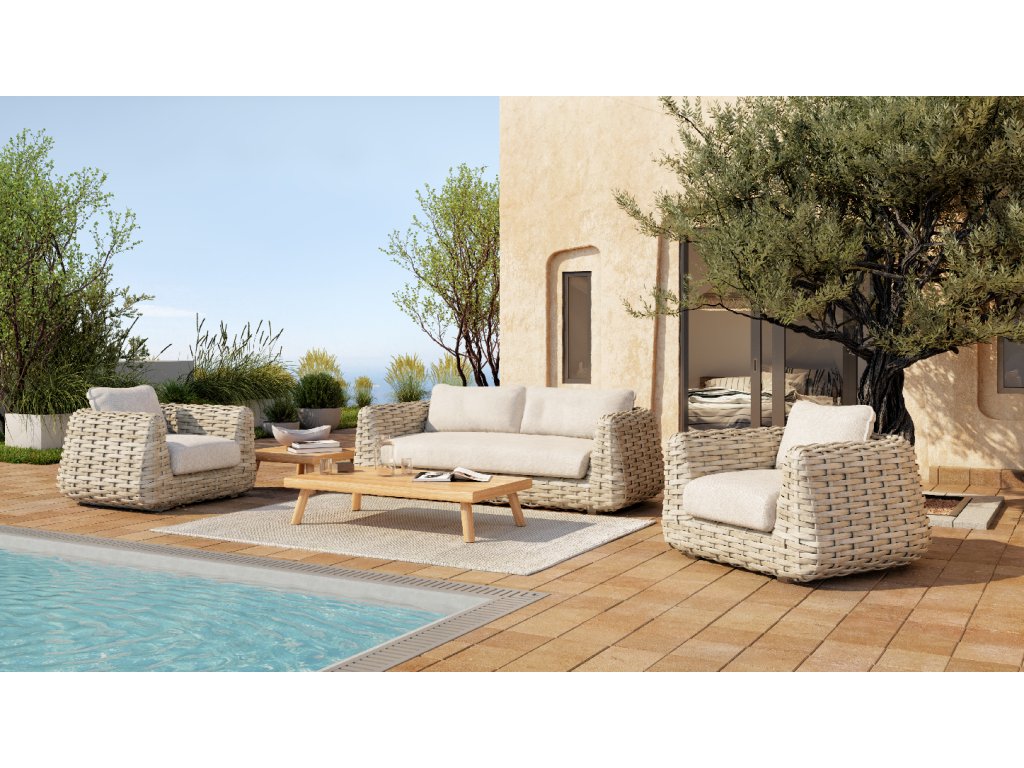 Wakkanda má jemný, príjemný a prirodzený vzhľad. Zaoblená tkaná štruktúra dodáva súprave organický, sochársky charakter, zatiaľ čo svetlé tóny vytvárajú pokojnú a rafinovanú atmosféru. Veľkoryso polstrované vankúše, čalúnené olefínovou látkou, zvyšujú pohodlie a vizuálnu mäkkosť, výsledkom čoho je uvoľnený a vyvážený vzhľad, ktorý pôsobí v každej záhrade elegantne a bez námahy.